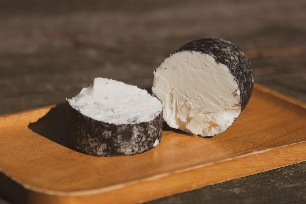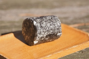 酸凝固チーズ独特のもったりとした滑らかさで、ヤギ乳の風味が舌の上に深い余韻として残ります。全体に食用木炭をまぶすことで、水分と熟成の調整をしています。